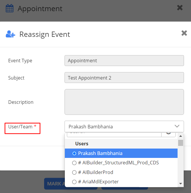 Select the user or team from the look-up records box to which the activity is to be reassigned.