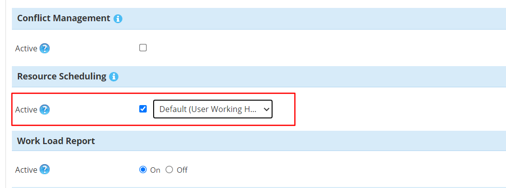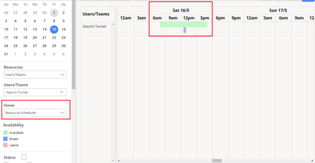 Click on the “Settings” button and navigate to the “Resource Scheduling” section. If the “Default (User Working Hours)” option is selected, the User can add the working hours from AppJetty Calendar and schedule the activity based on the Working Hours. You can also manage the working hours, break timings, and leaves in Calendar 365.
