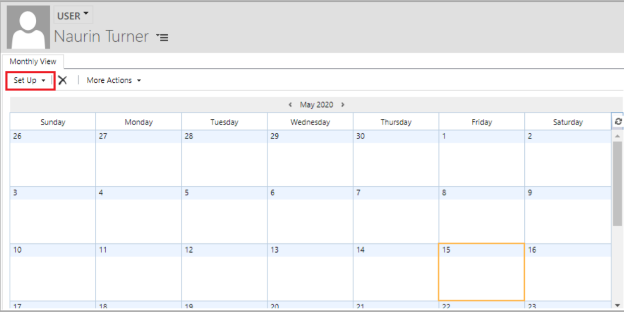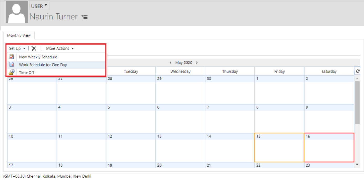 By clicking on Work Hours, the default calendar of CRM will display the records of the selected user if already inserted.