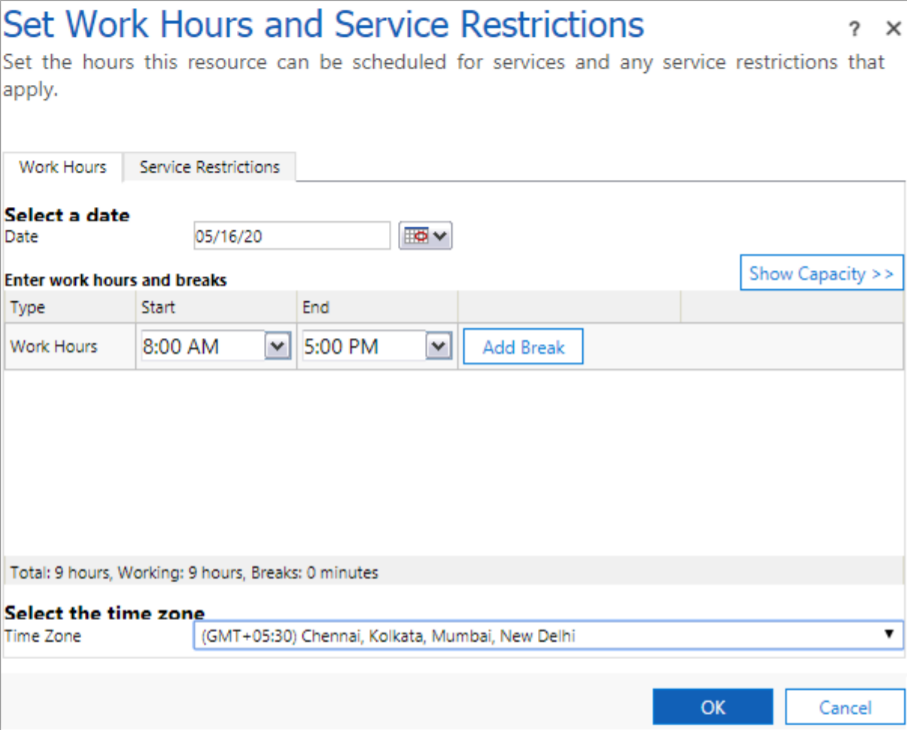 Note: You can only view the Working hours which is set in the CRM default calendar of the user.