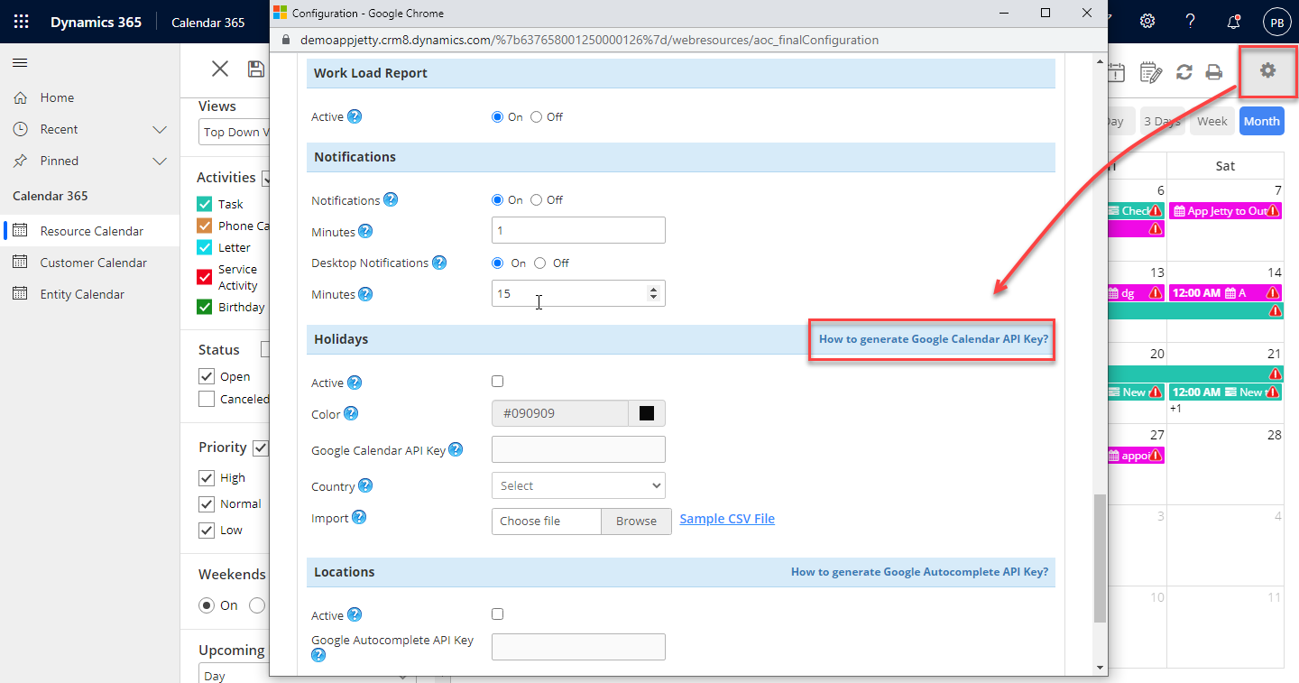 Click on the Configuration button, you will land on the Setup page. Now scroll down to the Holidays section and click on the How to generate Google Calendar API Key?