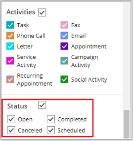 To view the activities as per their statuses, navigate to the “Status” section and check the checkbox beside each option to display the activities with statuses in the calendar. The Status option has 4 categories that are Open, Completed, Canceled, and Scheduled.