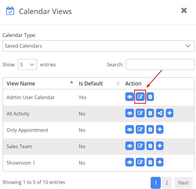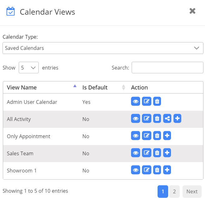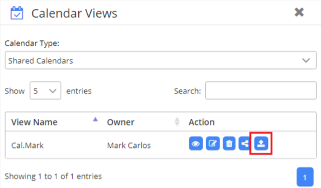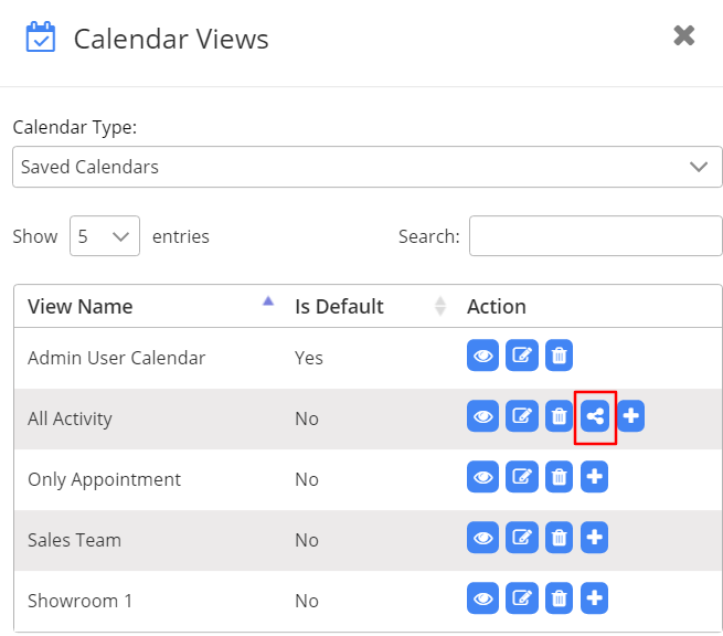 From the Saved Calendars list, you can see the View name with their actions. You can select the default calendar by clicking the “+” icon.