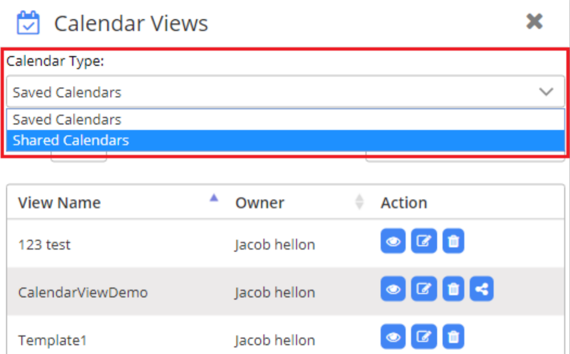 You can select the Users/team with whom you want to share the Saved Calendar view.  A calendar view shared by others can be seen by selecting the “Shared Calendars” option.