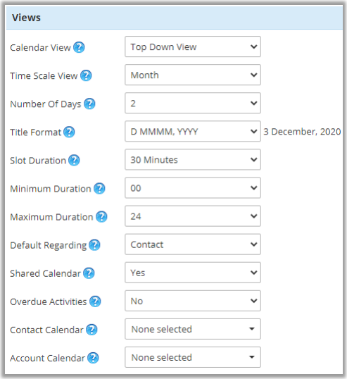 - Configure the default view of the calendar under the “Views” section in the “Configuration” settings. By configuring the individual setups/options, you can define the view of the Calendar.