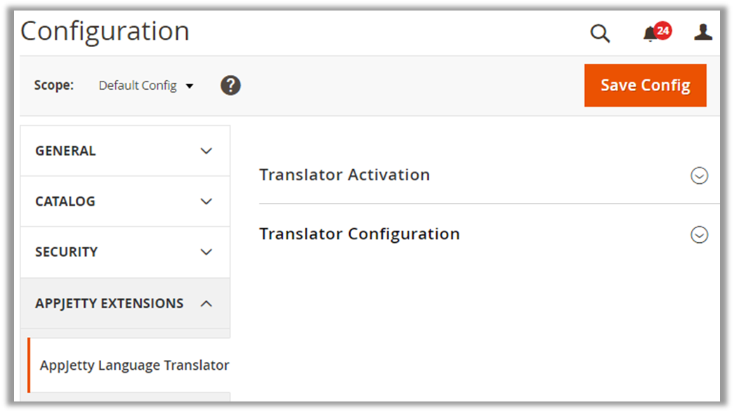 Log into Magento Admin Panel and navigate to Stores -> Configuration where you find the “AppJetty Extension”. Click on the AppJetty Language Translator.