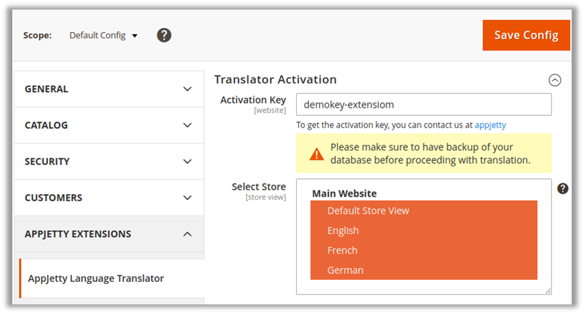 Select Store: When you enter and save the key it will be verified, and you can select the websites where you need to use the Language Translator extension. Click on the ‘Save Config’ button after making your selections.
