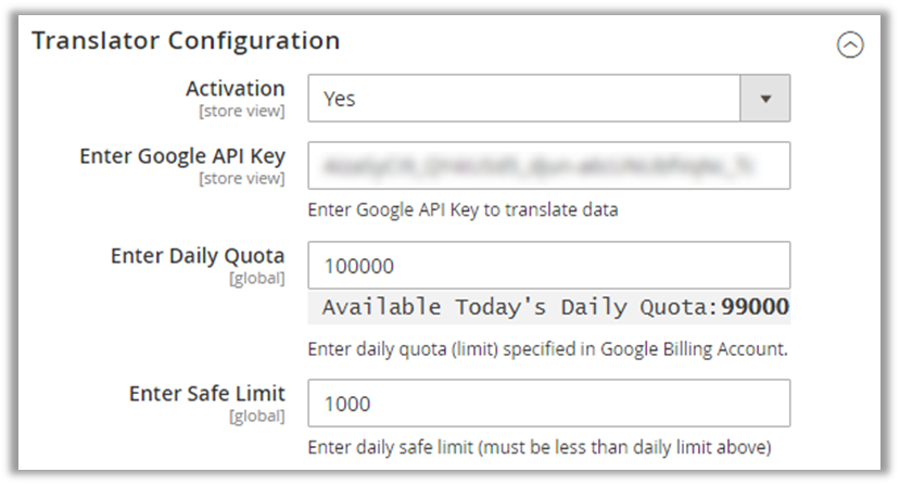 Enter Daily Quota: Enter the daily limit specified in your Google Billing Amount. You will also get the “Available Today’s Daily Quota” (Real-Time), so that you can manage translations per quota availability.