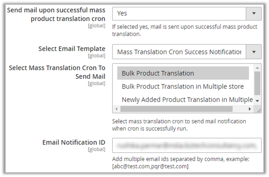 Send mail upon successful mass product translation cron: Enable this option to send a mail notification once mass product translation is successfully completed.