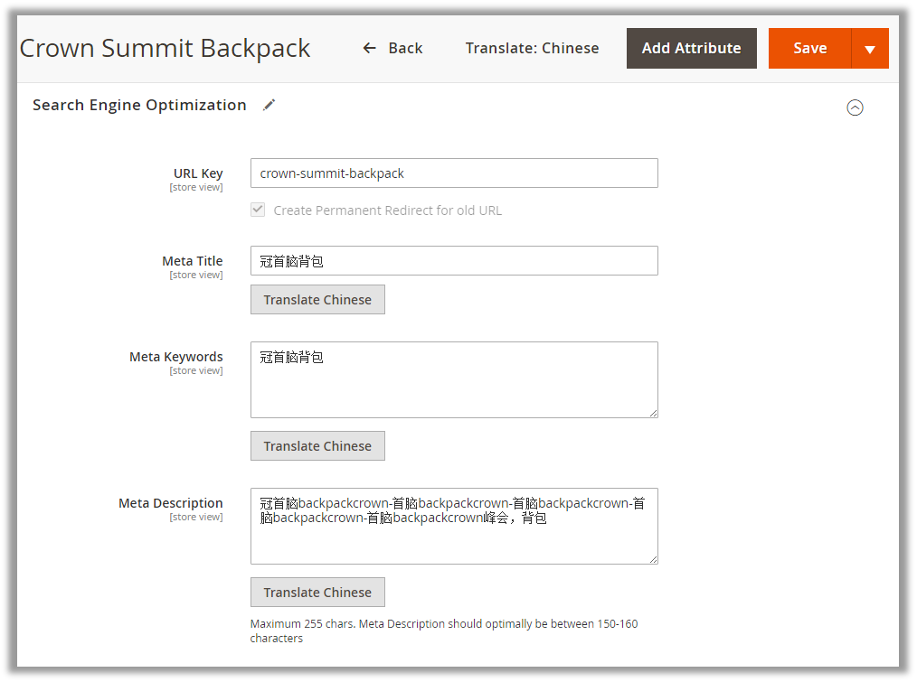 Click on ‘Search Engine Optimization’ to translate the Meta Title and Meta Description of the product. [4]