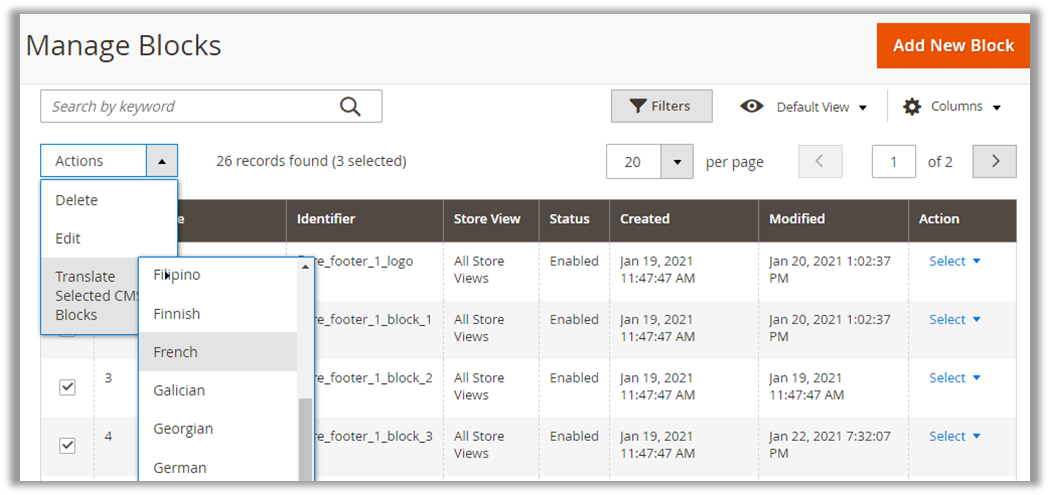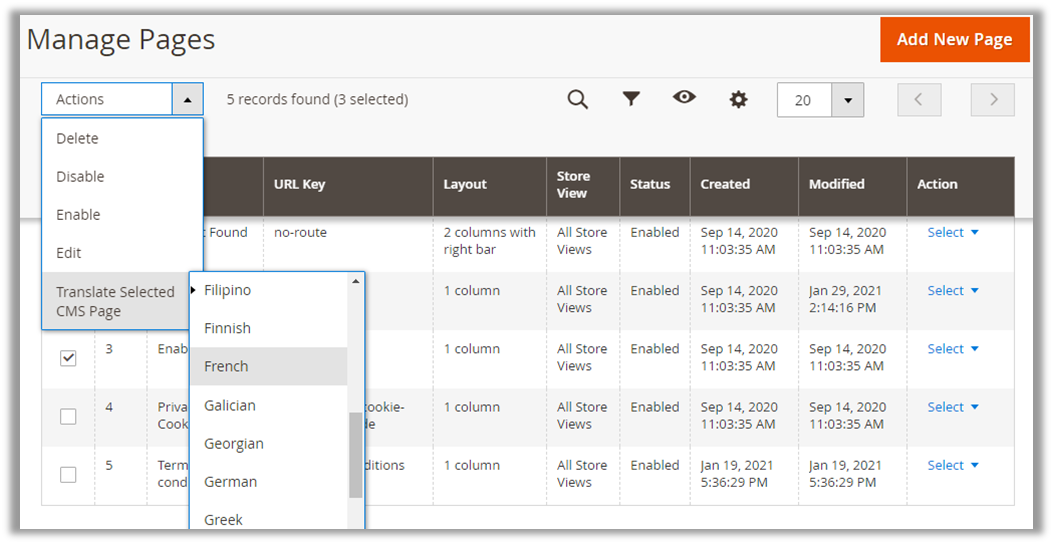 From the ‘Action’ dropdown list, click on ‘Translate Selected (Pages/Blocks/Product Reviews)’. A list of languages will appear; select the language in which you want the selected attributes to be translated.