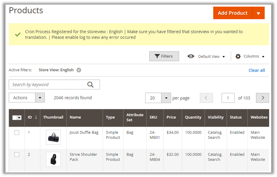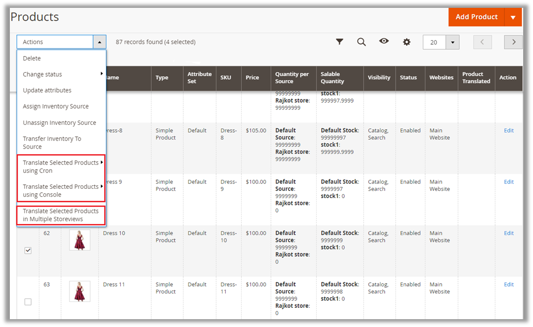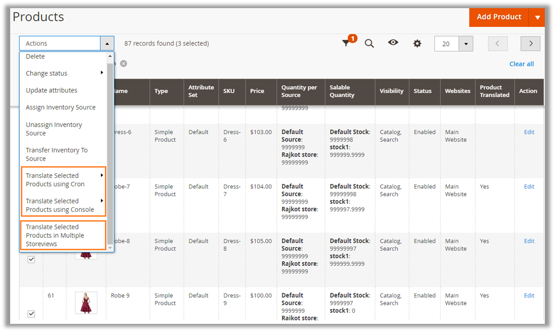 Note: The mass translation of the product will be carried out through a CRON or via Console and only one CRON or one command in a console can be registered at a single time. And if you wish to view the status of translated products, navigate to the Catalog -> Product -> Grid and under the ‘Product Translated’ column you can view the status of Product Translation included in the Mass Translation.