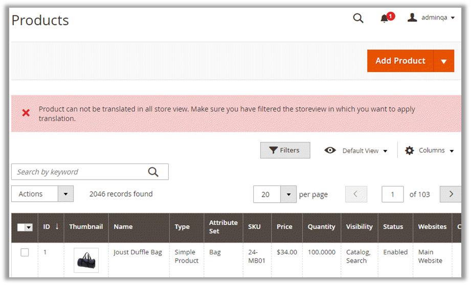 By clicking on Add Product to Translate using Console button, you need to add products in product translation from the product grid page. [5]