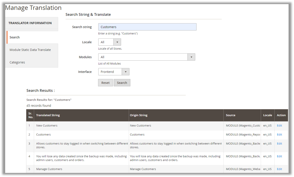 Enter any string you want to translate in the search box. [2] Click on the ‘Edit’ option of the string you want to Translate and translate into any of the Languages that you want.