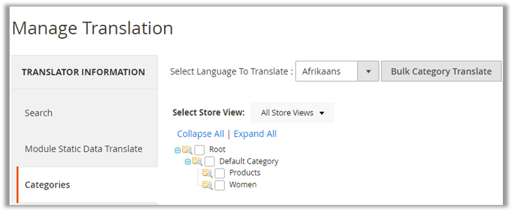 Select categories that you want to translate. Select the translated language and that category will be translated in all store views. [4]