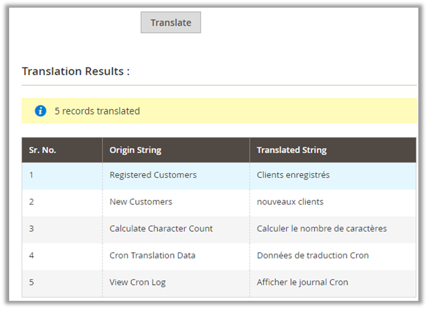 Here, you can view a list of all the translations for multiple stores that are enabled from Store -> You will get the status of the translation: ‘Pending’, ‘Success’, ‘Aborted During Cron process’ and ‘Aborted By Administrator’. [2]