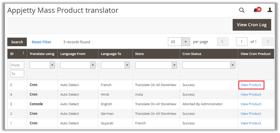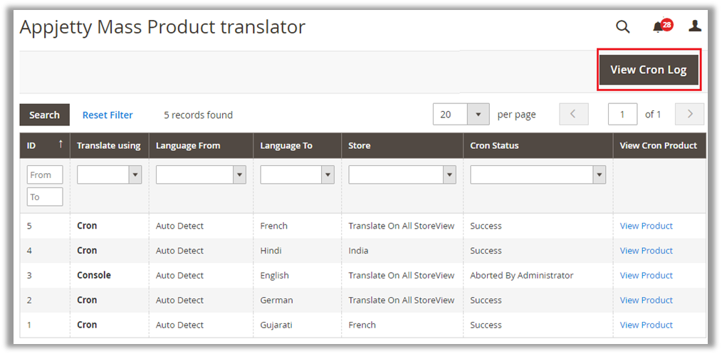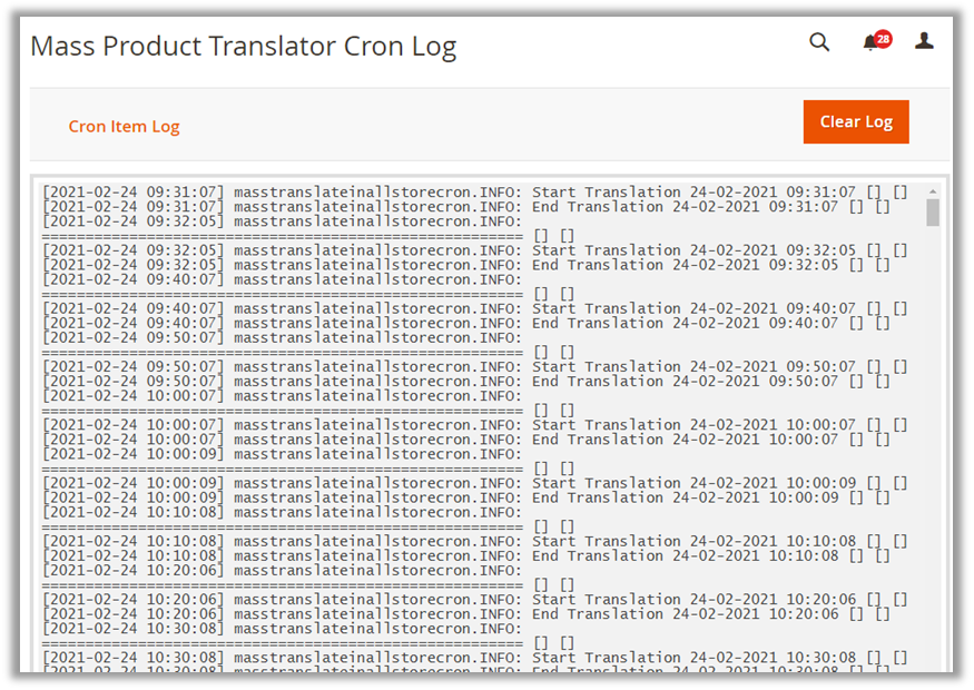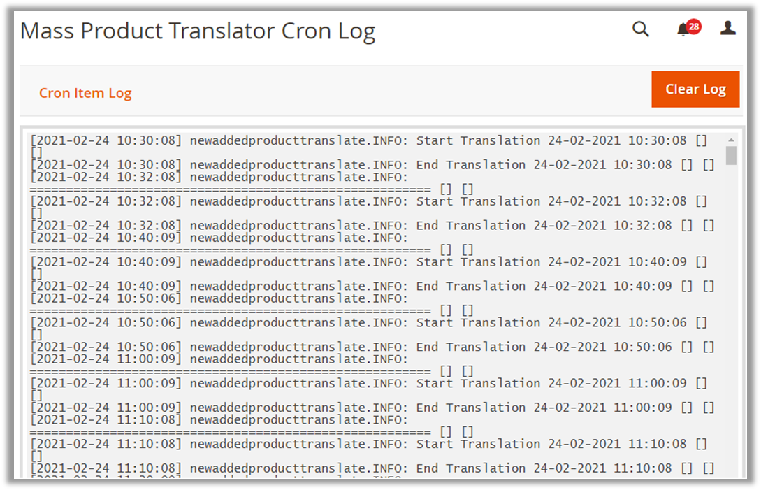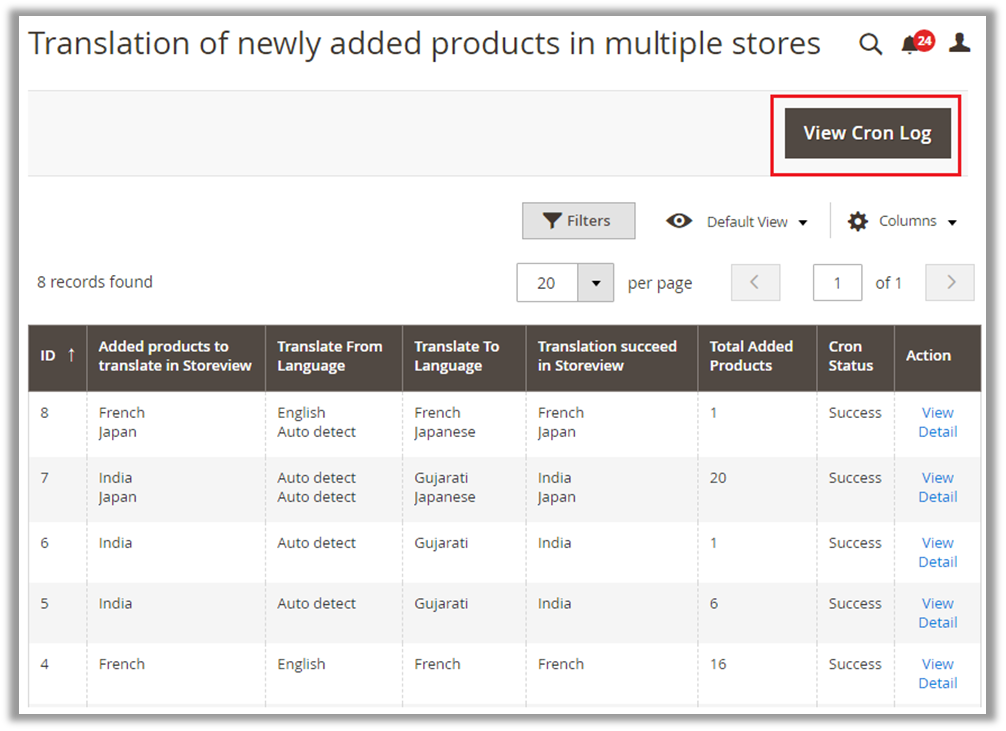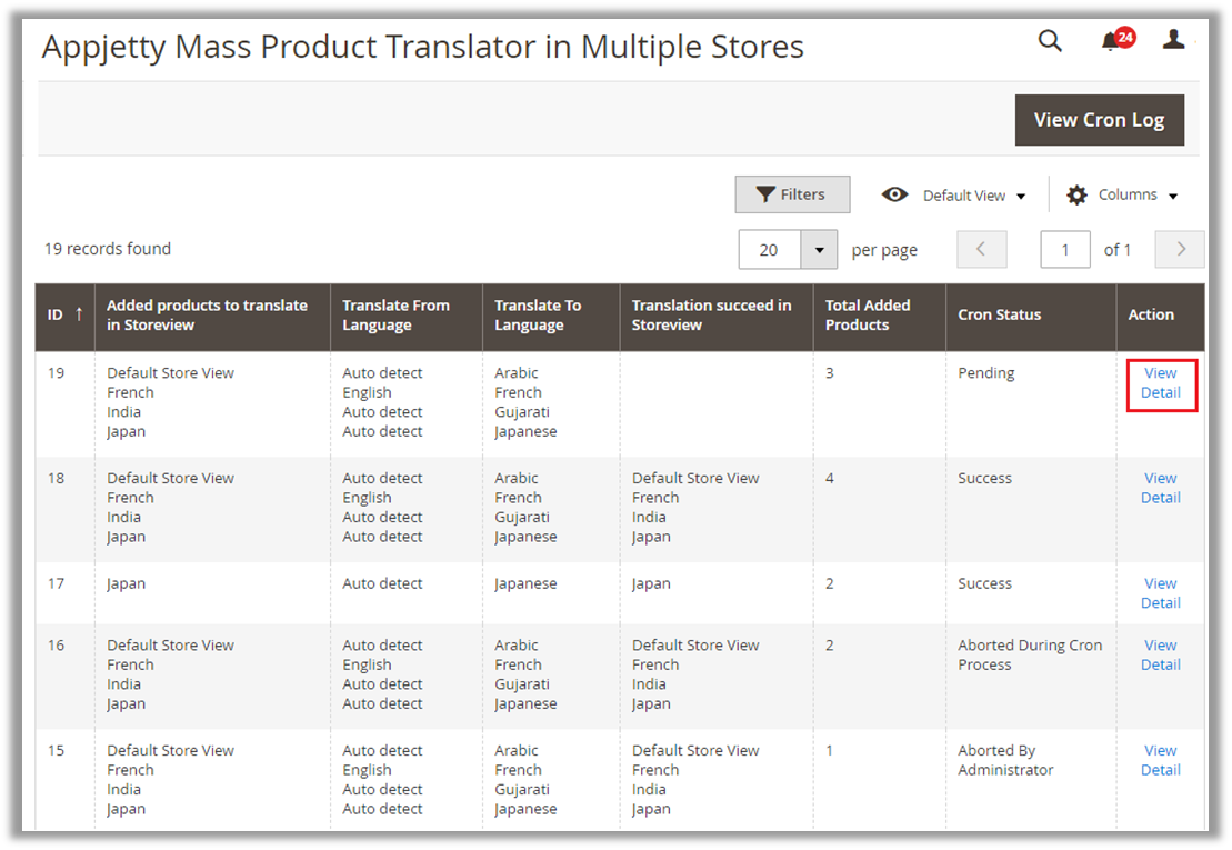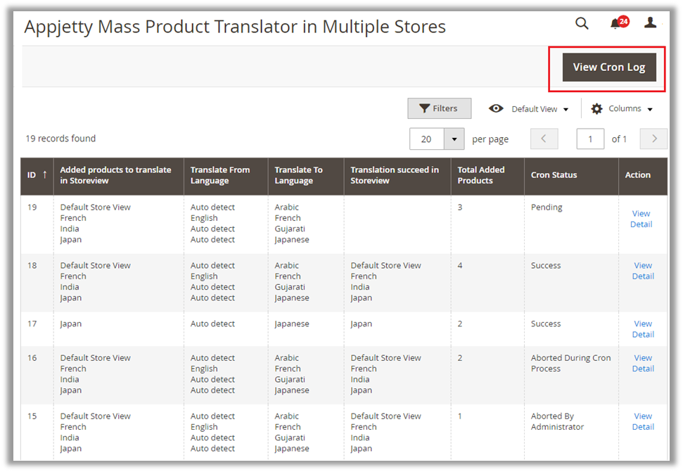 By clicking on the View Cron Log button, the admin can check the logs of the mass translations of newly added products in multiple stores. [4]