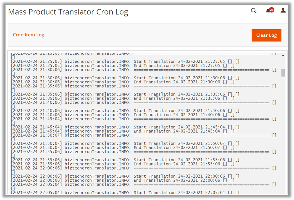 By clicking on the View Cron Log button, the admin can check the logs of the “Mass Product translations”.