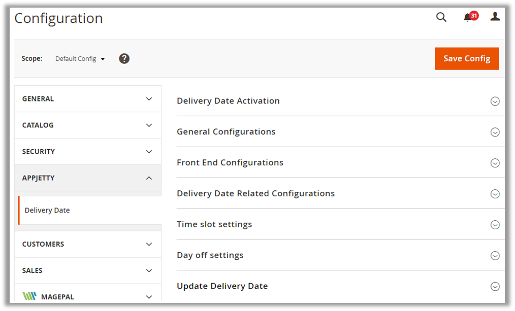 Log into Magento 2Admin Panel and go to Store -> Configuration -> Appjetty Extensions /Delivery date Activation and enter the activation key in the ‘Activation Key’ field for the Delivery Date Scheduler extension then click the ‘Save Config’.