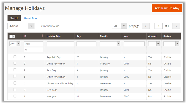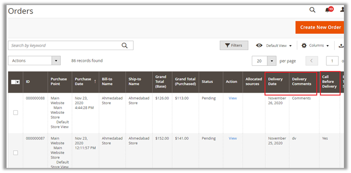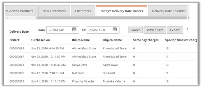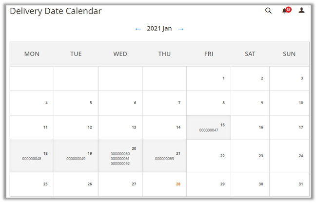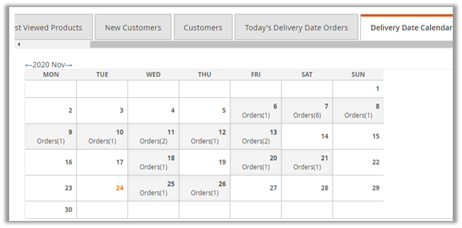 From the calendar, you will get the order number detail as per the ordered date. By clicking on the order no., you will redirect to the order details page (Sales -> Orders) from where you can check the order details and delivery date for the select order.