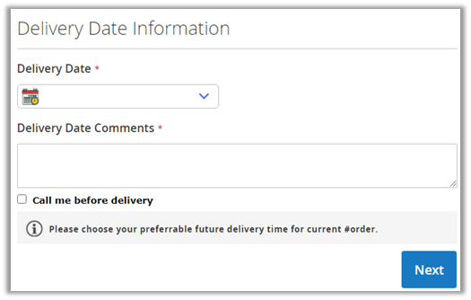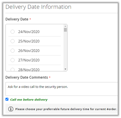 Under the Shipping Method, the customers will get the Delivery Date Information. The customers can select the required Shipping Method and Deliver Date with its required details.