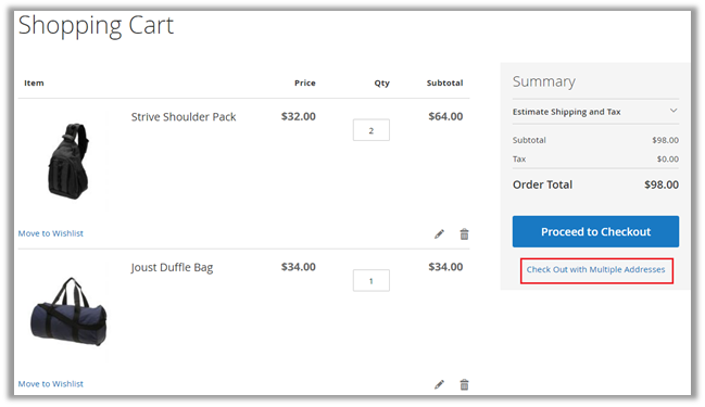 The customers will get the option of “Multiple Addresses” on the Shopping Cart page.