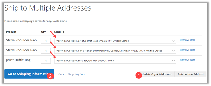 Once addresses are selected, click on the “Update Qty & Addresses” button, and go to the Shipping information page.