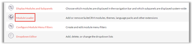 To start with the installation, Log-in as Administrator into SuiteCRM. Go to the Administration page and click on ‘Module Loader’ to install the package.