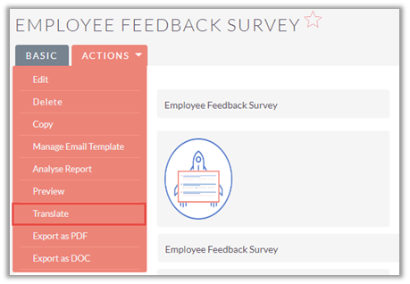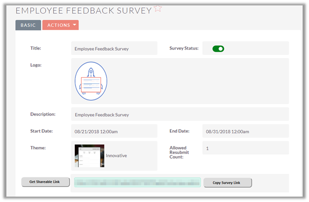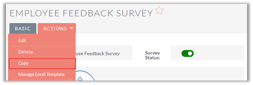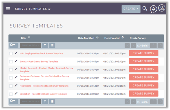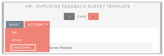 Once you save a survey template, you will be able to create multiple surveys using that template. In Survey Template Detail View, you will see a Drop-down arrow besides the Edit button at top right corner. By selecting ‘Create Survey’ Option from the list you can create a survey using that template.