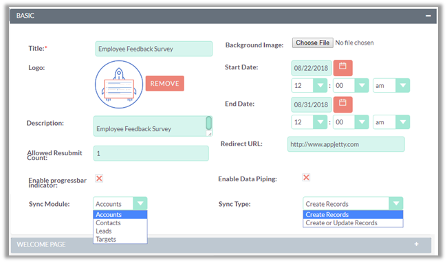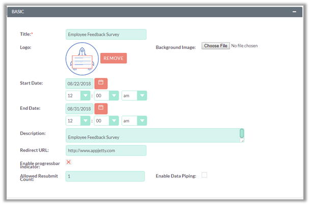 Give a Title to your Survey, mention the Start & End Date of the survey. You can also upload a logo of your choice and/or add brief description of the survey, upload a background image for survey.