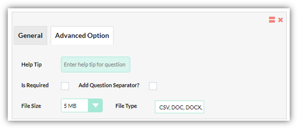 Under advanced option available within Attachment Question Type, user can restrict file upload size and file extensions for particular file upload. Upload size can range between 1 MB – 5 MB.