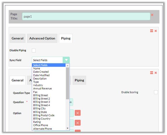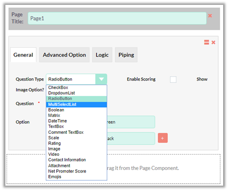 Scoring feature can be enabled for 4 types of questions viz. Checkbox, Dropdown list, Radio Button and Multi Select List.