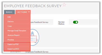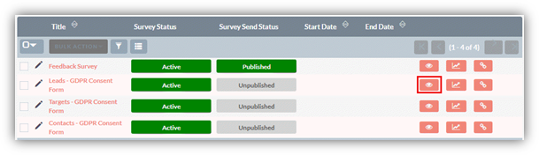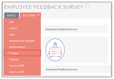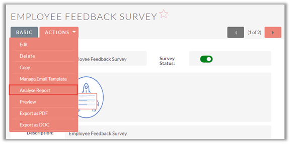 To view survey report from the list view, click on ‘Analyse Report’ icon besides preview icon. Selecting the option, report gets opened for that survey.