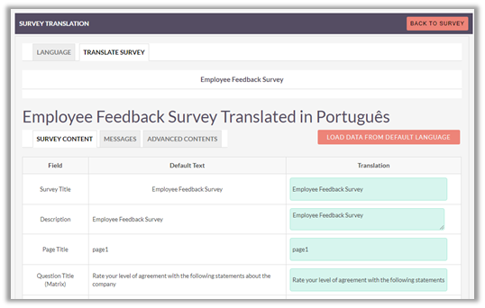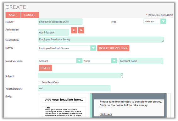 One of the most common methods of a Survey Template creation is via the ‘Create Survey Template’ option in the Survey Template module tab. This opens up the edit view layout which allows you to set Survey form with different Survey Questions with pagination.