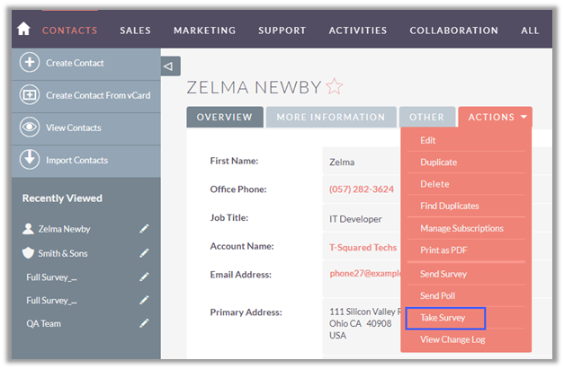 To create a new survey, select ‘Create Survey’ option from the Survey Template detail view or navigate to Survey module and click on ‘Create’ button.