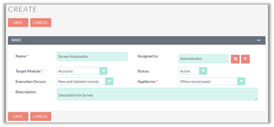 Enter a name for survey automation workflow, select an option from the dropdown to mention when the execution must occur, select a target module for the workflow and then select the type of records on which the automation must trigger.