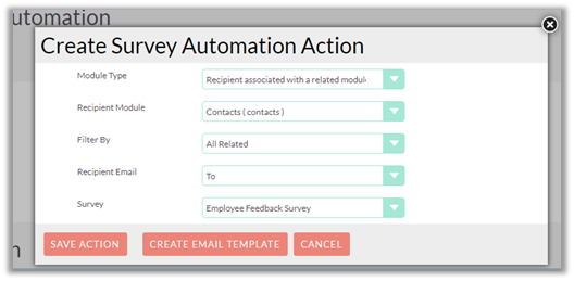 Now, set the actions to determine the recipients to whom the survey will be sent. Select the recipients associated with either target or related module from the dropdown. Select the related field for the chosen recipient type.