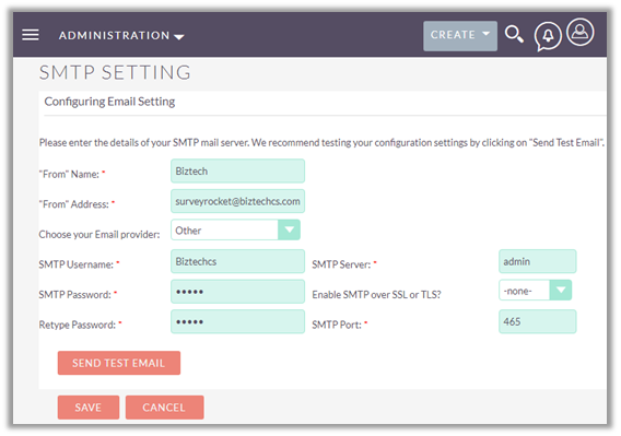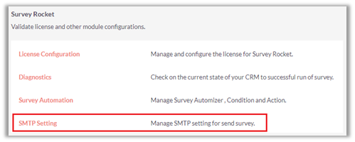 To configure SMTP for sending surveys, navigate to Admin Panel and click on ‘Survey Rocket SMTP Setting’ link.