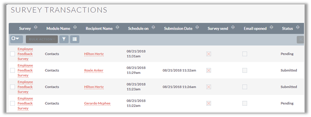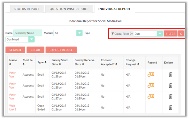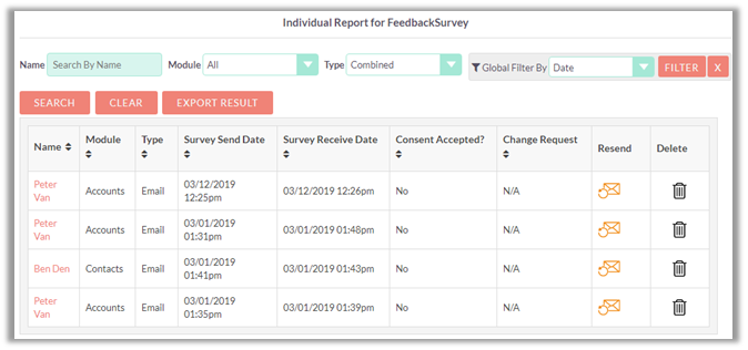 Individual Report displays the list of contacts to whom the survey was send. It displays the type of module, status (submitted or not viewed); survey send date and survey submission date.