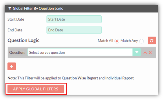 Filter By Question Logic: To filter data based on question logic, select Question Logic option from the global filter by dropdown and click on ‘Filter’ button. On clicking Filter button, pop up appears where you need to enter start date and end date if required and select question and its respective logic to filter results based on specific response.