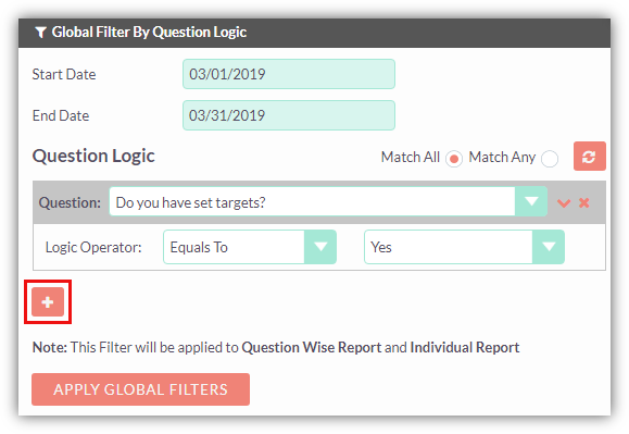 Multiple questions and its corresponding logic can be added at a time. To add more questions to the filter, click on ‘plus’ icon available. You can also reset the filter by clicking on reset button. For all the questions added in the filter, you can select the condition for them to work like Match All and Match Any.