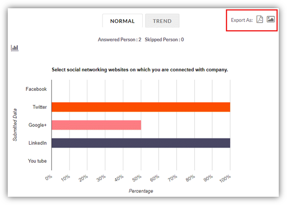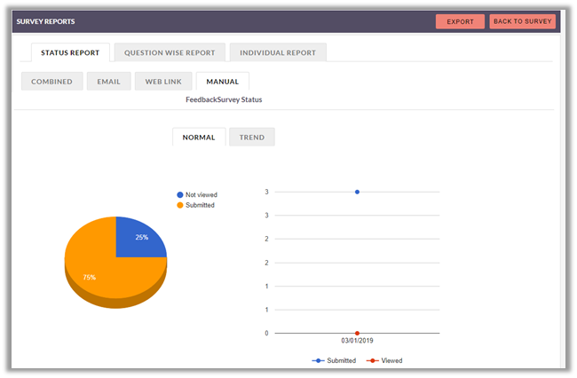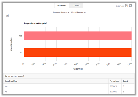 Click on Normal tab to view chart and count along with percentage of the submitted data. Clicking on Trend tab you get trend chart of the responses received for each question.