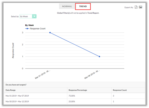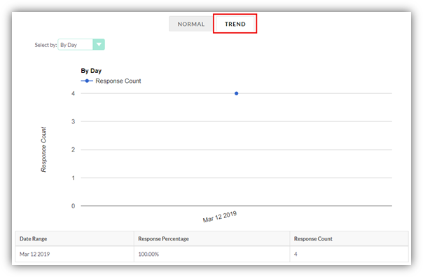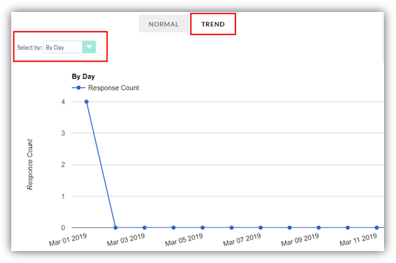 For trend report, there is a dropdown to view trend based on Day, Week, Month, Year. By default, it shows the period based on difference between the first response and last response received. Example: For gap of 6 days, it shows trend by day. If there is a gap of more than 6 days between the responses, it shows trend by week. If there is a gap of more than 4 weeks, trend report is shown by month and for gap of more than 12 months, it is shown by year.