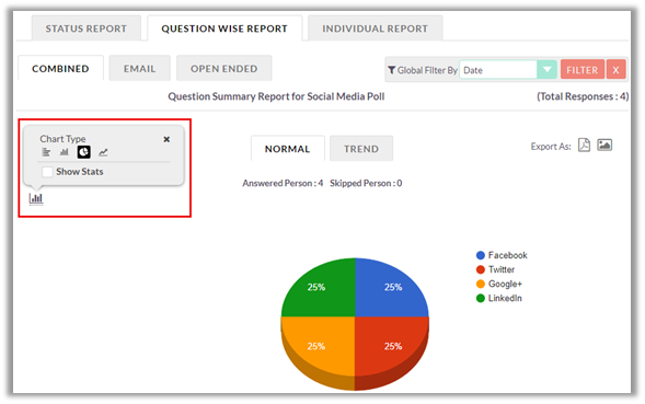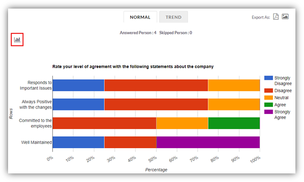 Options to switch between normal and trend report or changing the chart type is available for closed ended questions.