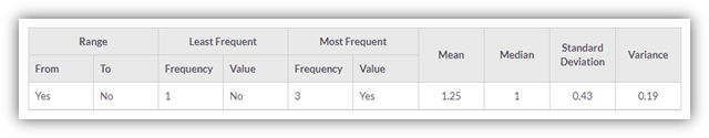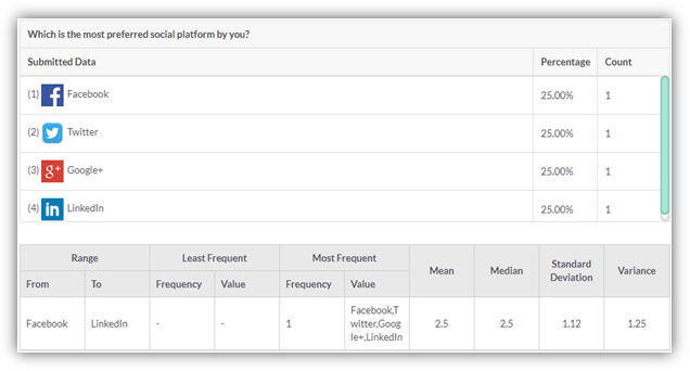 Statistics Table includes data like Range, Least frequent, Most frequent, Mean, Median, Standard Deviation and Variance calculated based on response received.
