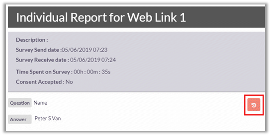 To view the detailed individual report of a respondent, click on the name field and it will display complete set of answers for that respondent along with time spent on survey.