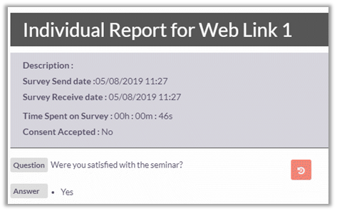To view the detailed individual report of a respondent, click on the name field, and it will display complete set of answers of that respondent along with time spent on survey.